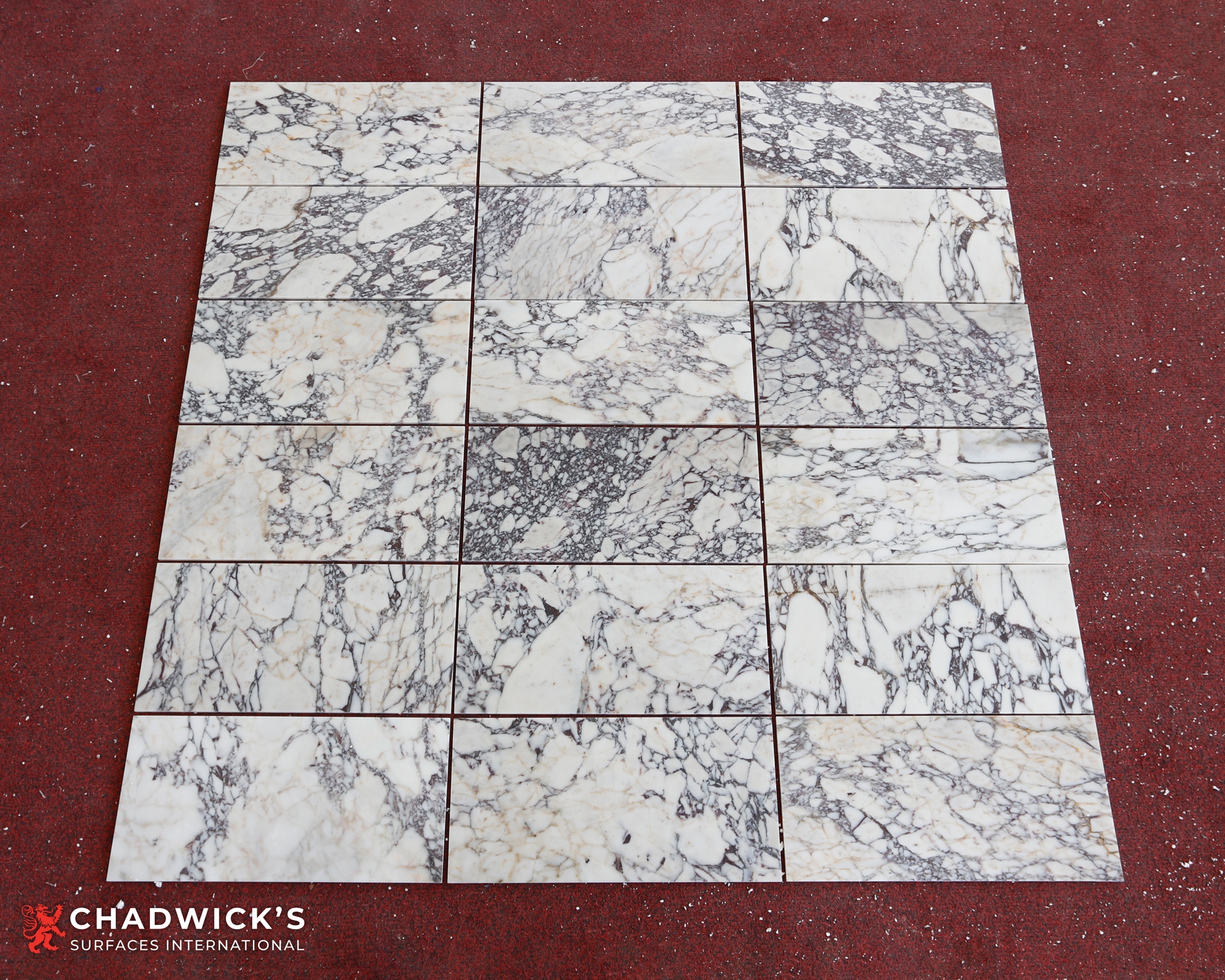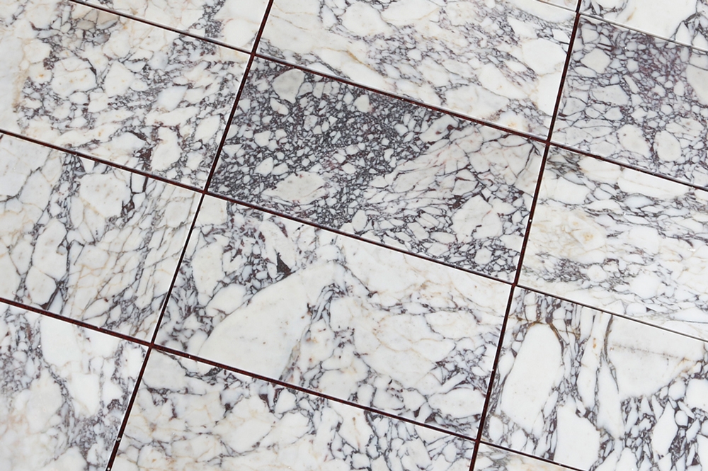 Exquisite selection of creamy white Calacatta marble with deep, violet jewel-tones and occasional creamy-gold veining.